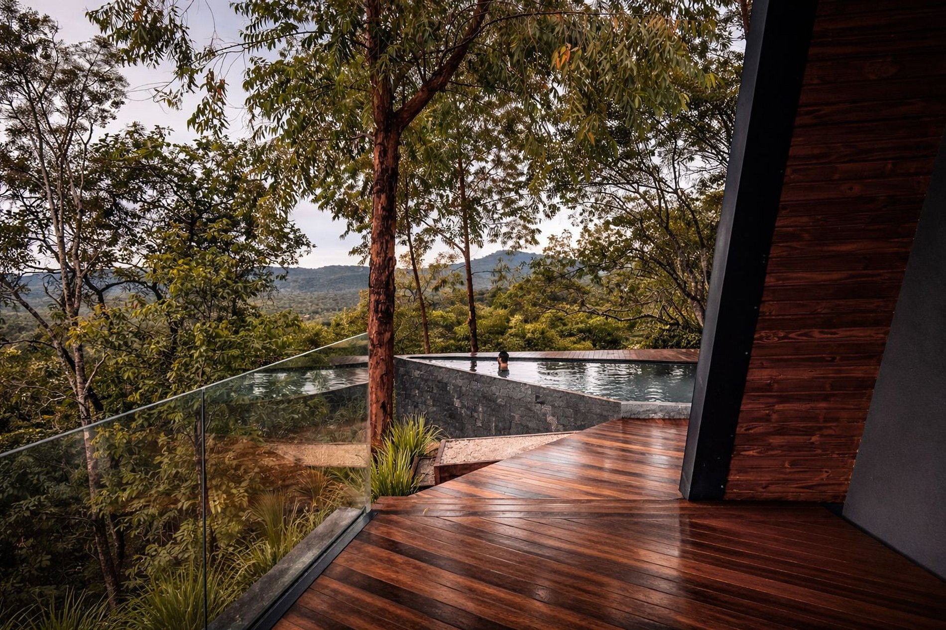 Na área externa, um deck frontal convida à contemplação do pôr do sol e das estrelas. A experiência se completa com um deck com banheiras de imersão com água quente e outro com piscina privativa aquecida, além de área de fogueira e churrasqueira para momentos especiais.
