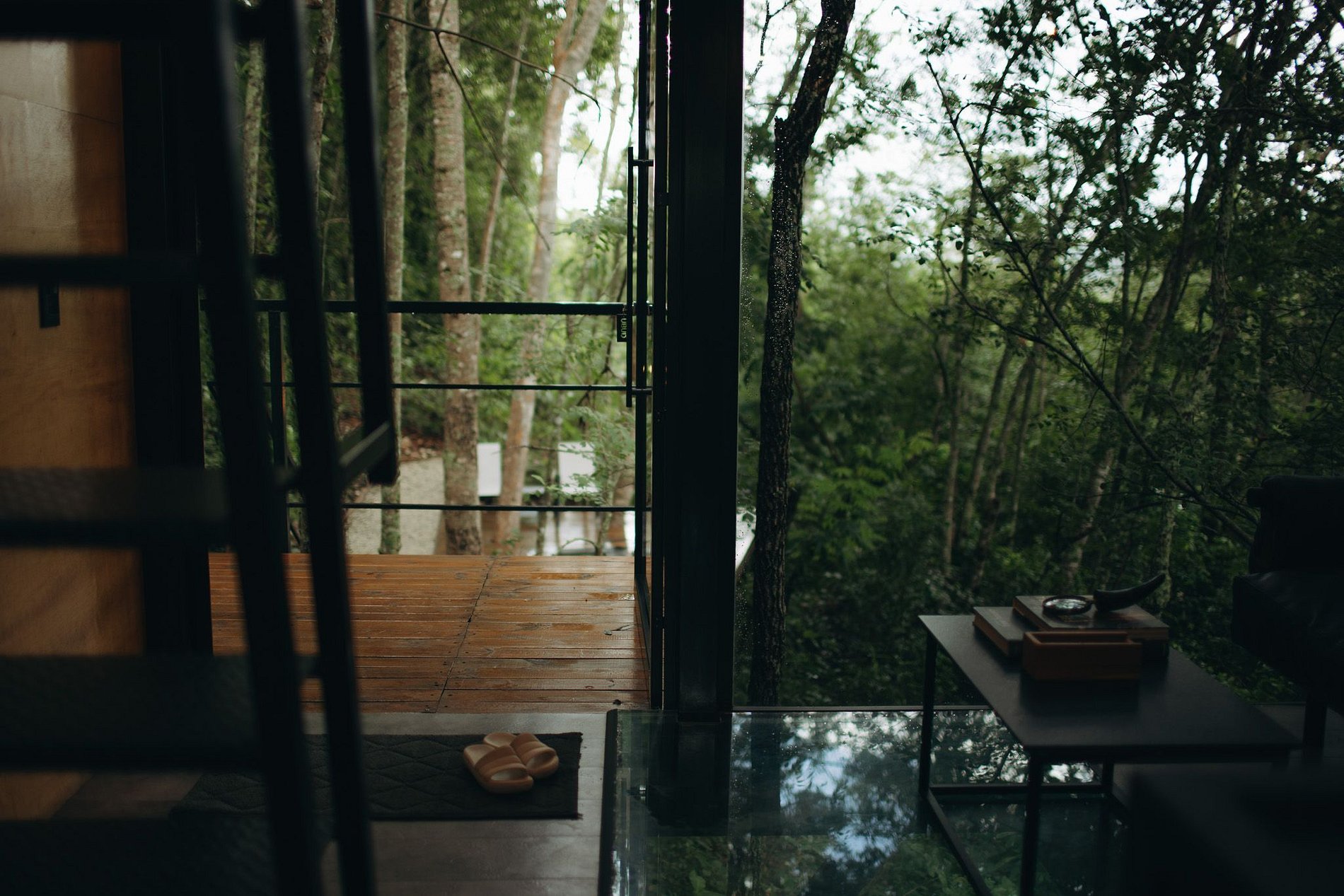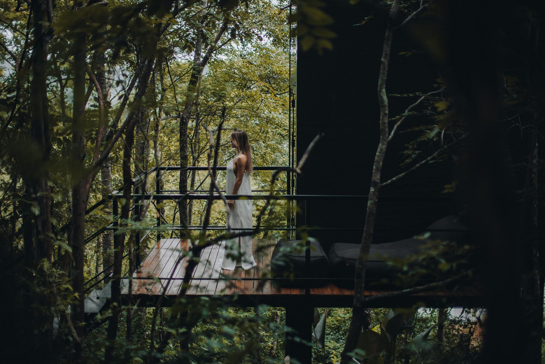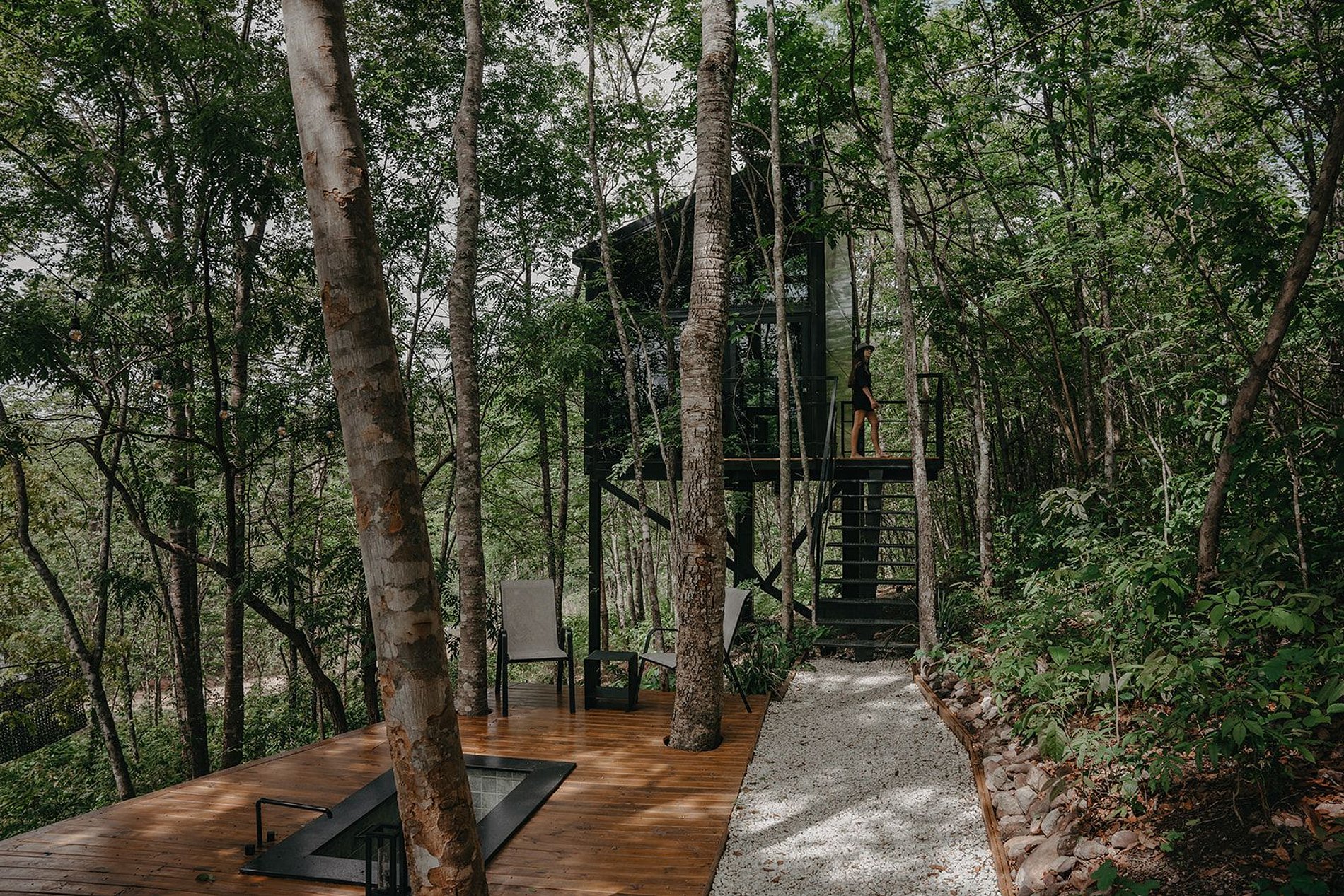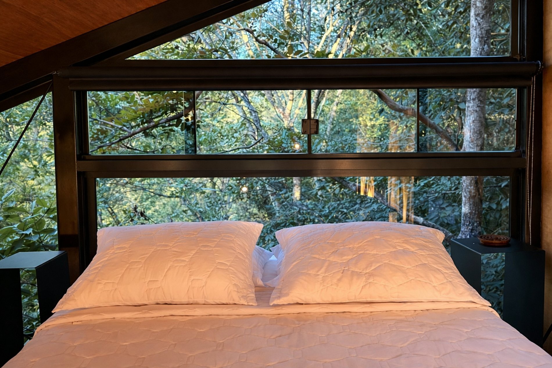 É uma cabana suspensa estilo casa na árvores, destinada para atender duas pessoas. O espaço interno é composto, no térreo: sala, cozinha, banheiro e no mezanino: o quarto. Para complementar a experiência, no espaço externo existe um deck com uma banheira de imersão, lareira/churrasqueira.